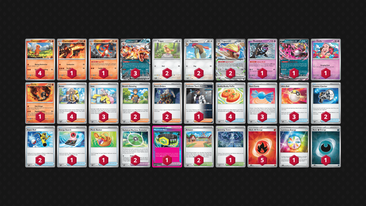 This version above is the most popular way to build Charizard ex right now – leaning heavily into the original plays that hav always made Charizard ex strong and consistent. This build uses Charizard ex to overwhelm opposing attackers, and Pidgeot ex to help you get what ever you need, whenever you need it.