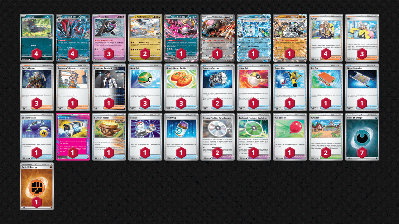The top placing N’s Zoroark ex deck at Worlds, however, went for more of a toolbox approach to the strategy rather than going all-in on N’s Pokemon. This approach seems to work well, integrating powerful anti-meta tactics like the Cornerstone Ogerpon ex to prevent damage from opposing Pokemon with abilities.