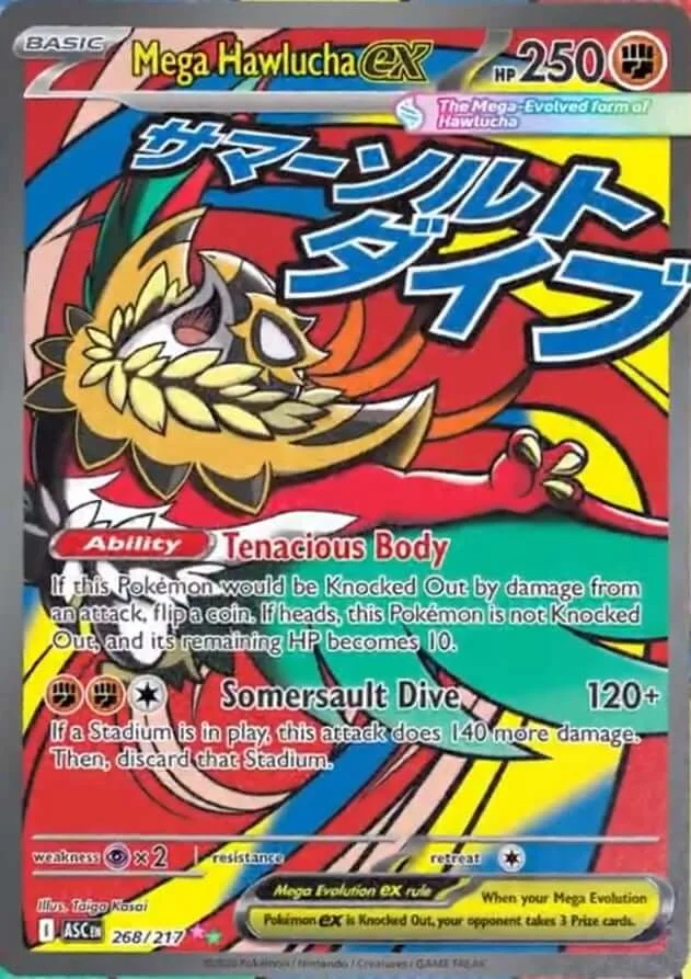 Leaked via its own unique trailer that sees Mega Hawlucha ex standing on the ropes of a wrestling ring, this is the first time we’ve had Mega Hawlucha in the Pokemon TCG. With the blue/yellow swirls and colors that are a staple of the Mega Evolution era, combined with a very unique protective ability and a strong attack, Mega Hawlucha ex will be very tempting to build around especially in fighting decks like Mega Lucario ex.