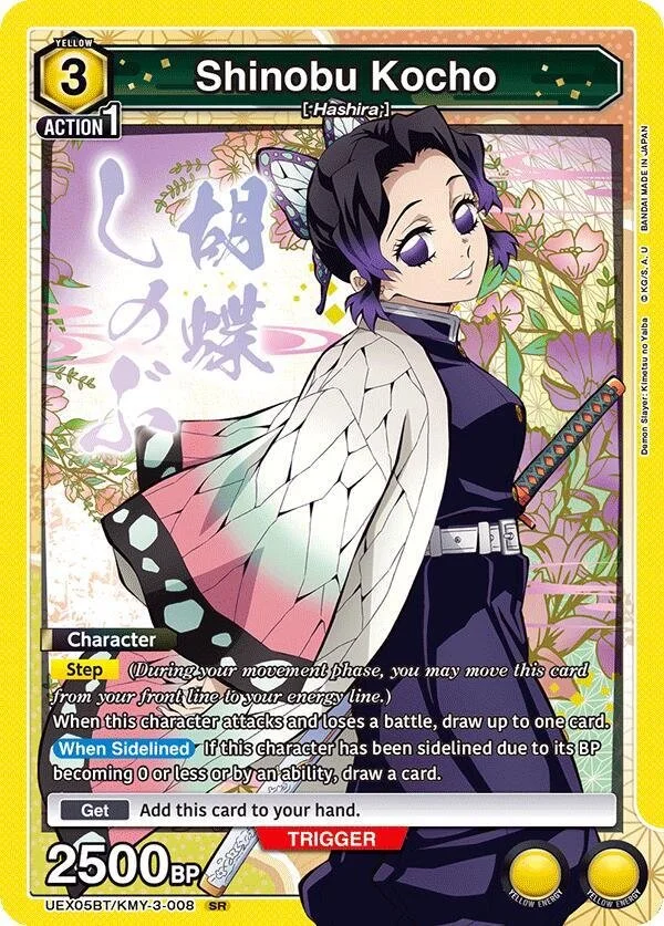 Shinobu is the perfect partner for this deck. First, she adds additional energy generation which you’ll be happy to have. But beyond that, she has two very handy draw abilities that fit Yellow Tanjiro like a glove. The first is an effect that lets you draw a card whenever she loses a battle. That’s going to happen a lot with the Nezuko swapping. As you attack with your Tanjiro and then switch into Shinbou, many times your opponent will take the hit with Tanjiro, then look to block the easy to block Shinobu. However, block Shinobu and they’ll be giving you more resources to your hand, ensuring your card advantage.