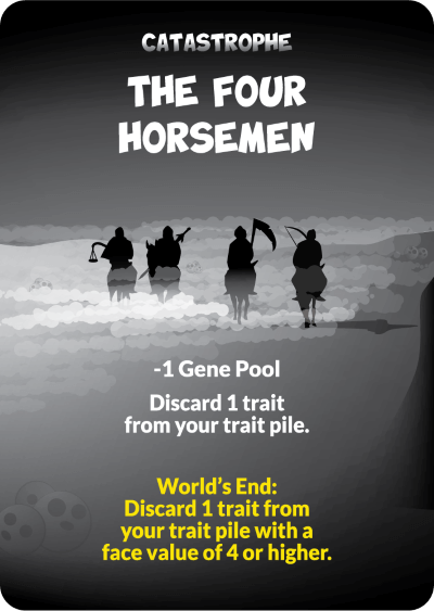 Each era ends with a Catastrophe: a special age card with (typically) adverse effects for all players. You never know when the next card from the age pile is going to be a Catastrophe which adds an element of surprise and anticipation to the game. And not only do you get to build up your own board with traits, you get to interact with your opponent’s board, hand and even discard pile in meaningful ways, making it a very fun and interactive game.