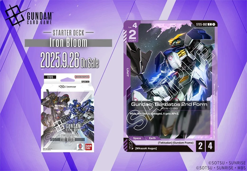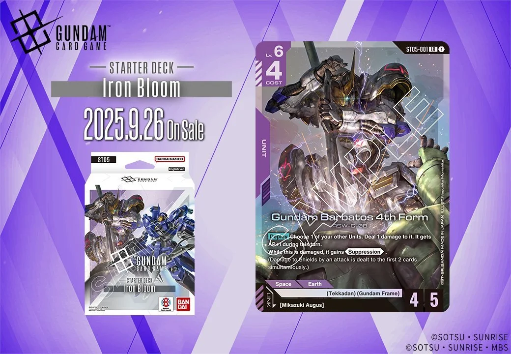 The first official English reveal for a card from the Iron Bloom starter deck is Gundam Barbatos 2nd form. Consisting of the new purple color, the Barbatos introduces a new mechanic for the Gundam Card Game – one that sees an increase in AP from the unit being damaged. Could more cards get revealed that intentionally damage your own purple units to unlock effects, thereby bolstering this card’s efficacy? Could be, but it’s an exciting new card to be included in the game either way.