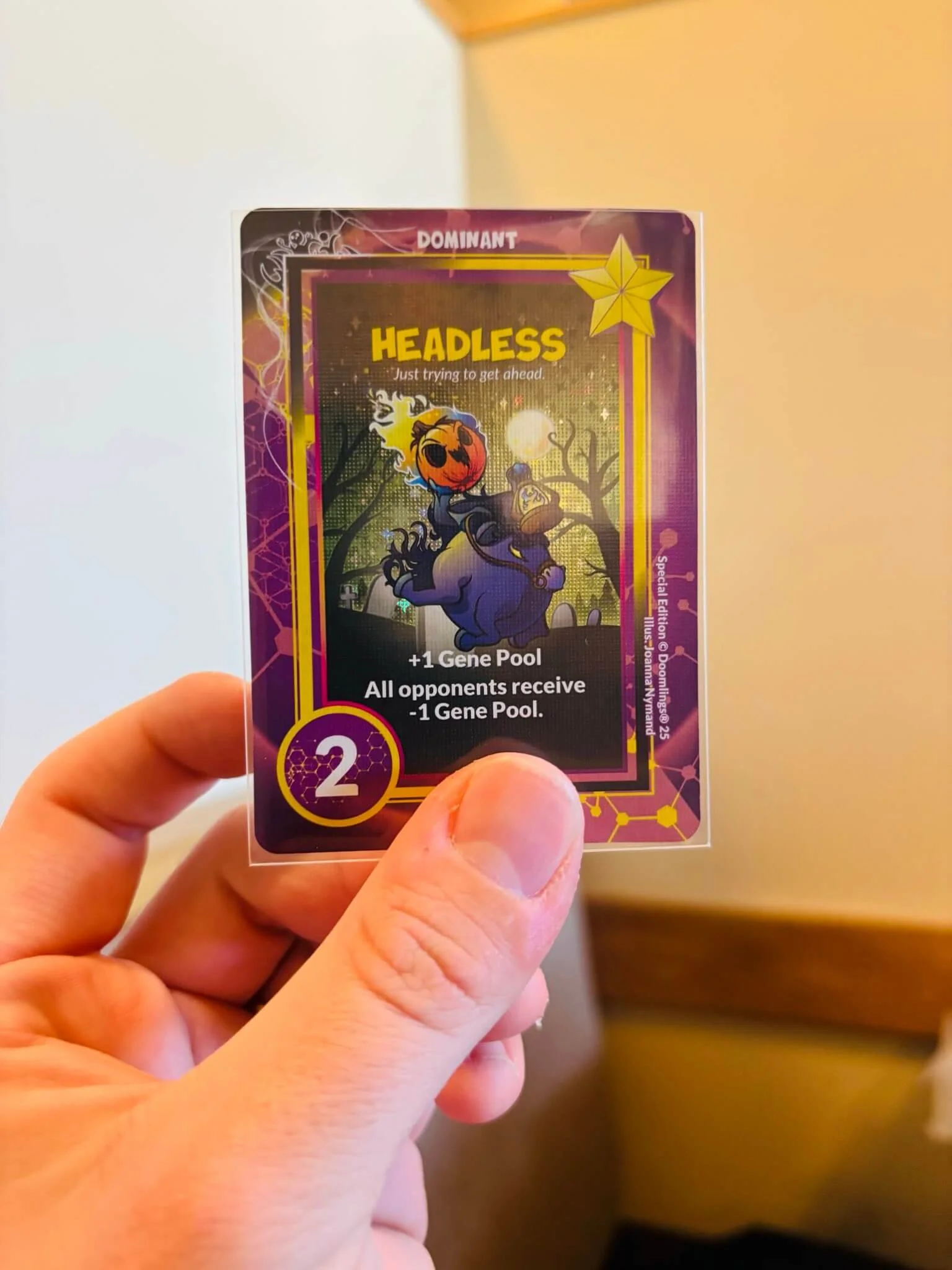 Here’s a special limited edition Headless Horseman card that Doomlings sent me during their Halloween promotion. You can get similar foil cards like this in your expansions. And while they won’t be the headless horseman I thought I’d share a picture of that card because the foil cards certainly add a layer of fun and collectibility to playing this game!