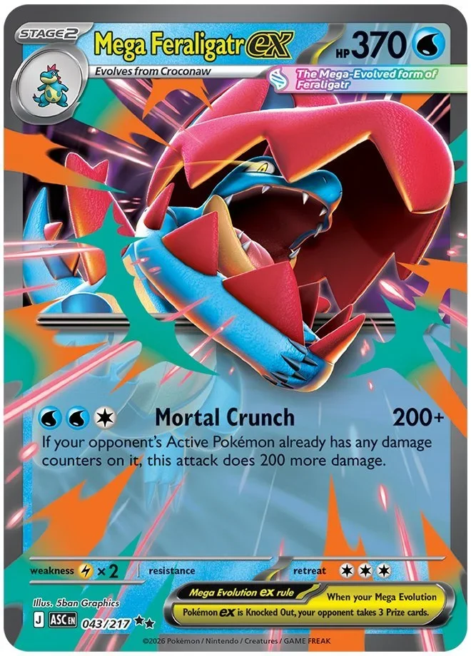 Although it has admittedly been a while, there was a time when Feraligatr was a competitively viable rogue deck. Mega Feraligatr ex could be the extra juice it needs to show up at the top – at least in more casual play or on Pokemon TCG Live. Mega Feraligatr ex isn’t a very nuanced Pokemon: it’s more of a blunt but very effective instrument.