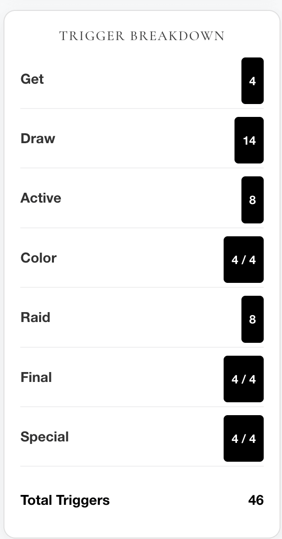 For this reason, I’ve built a comprehensive Trigger Breakdown into the deck builder, one that will update as you build your deck. The Trigger Breakdown view will show you: