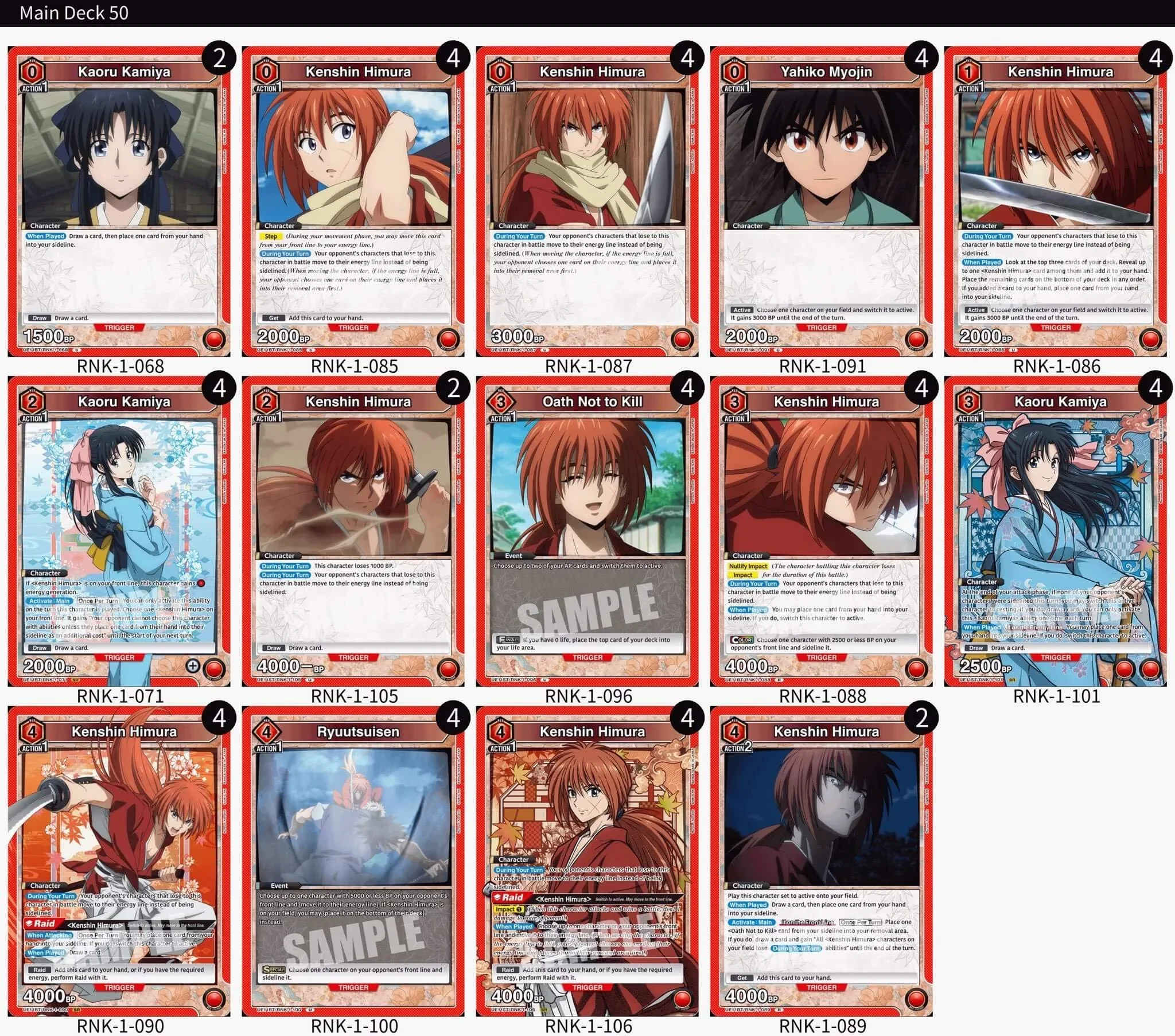 Rurouni Kenshin should also be a popular Rare Battle format, although it’s decks are more proven in the English version of the meta. While players will undoubtedly play a wide range of Rurouni Kenshin decks given how strong many are, ultimately the strongest matchup will come down to Red Kenshin vs Purple Saito. Both are strong decks that counterbalance one another, and I’m sharing two optimized builds below: one from a second place deck at a case tournament by Vexsten and the other by Regional Champion, Mylo.