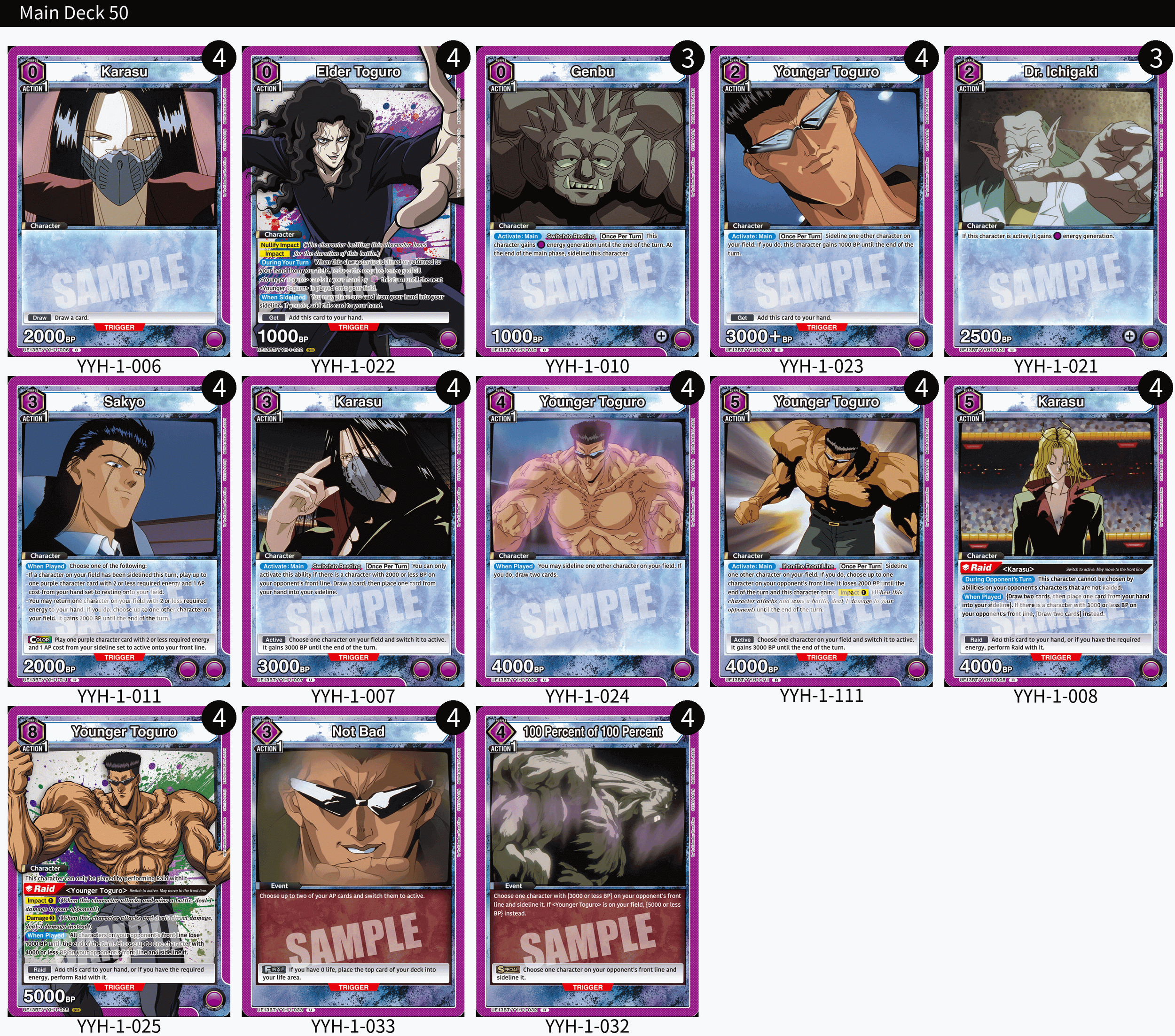 You can think of Toguro as a slightly less effective Green Lancelot. It hits hard, has plenty of removal, and offers some decent consistency as well. While there are many strong Yu Yu Hakusho decks that can certainly compete with it, my money is on Toguro for being the standout deck in the Rare Battle format.