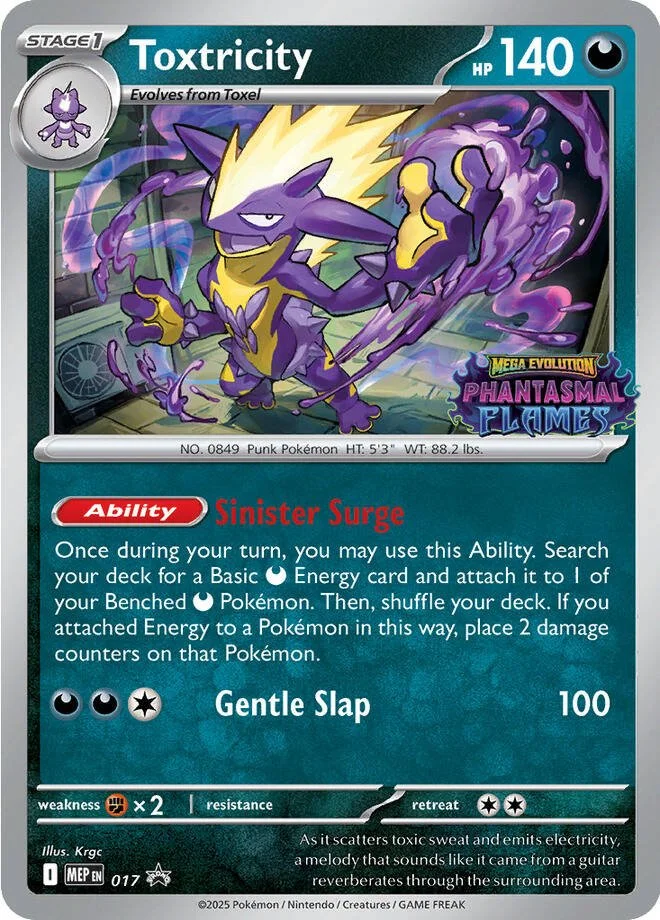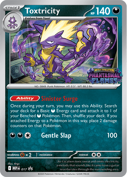 Speaking of Mega Battle cards, Toxtricity plays a key role in that new deck archetype by enabling you to easily accelerate energy onto your dark type Pokemon.