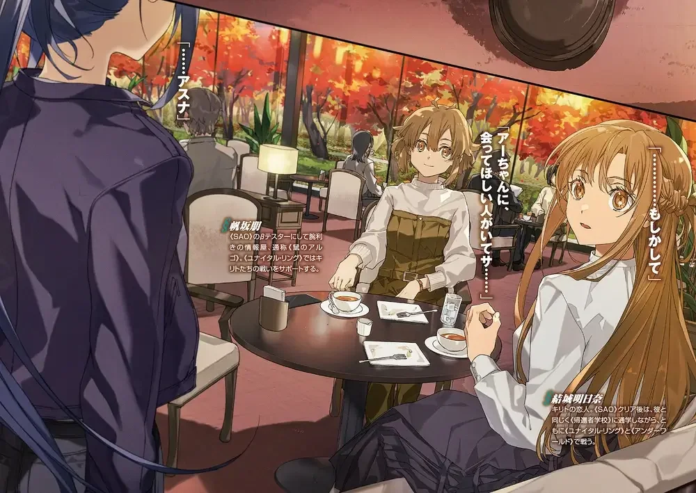 The most action packed moments of Vol. 28 take place within the first few opening chapters. Once the battle ends and Asuna saves the day, we head back to the real world and the action largely dies down. We join Asuna at a hotel restaurant by her old school where she is meeting up with Argo and a surprise character: Mito!