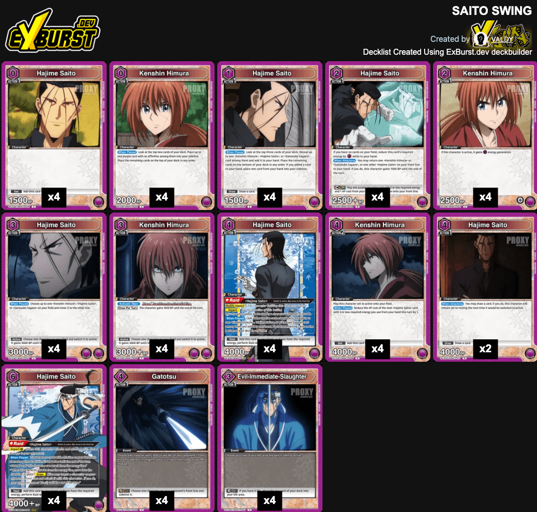 Despite Red Kenshin getting most of the publicity as the top Rurouni Kenshin deck, Purple Saito is a close second. This deck offers the unique mechanic of being able to attack from the back line, a powerful effect that enables you to dodge certain lethal threats like a Special trigger out of life.