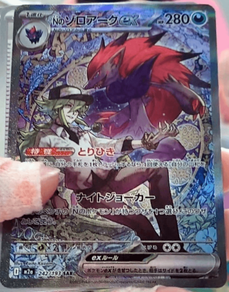 Speaking of Prismatic Evolutions, lastly we have this captivating look at N’s Zoroark ex SIR that very much follows the same kind of abstract floral patterns that made the Prismatic Evolution chase cards like Umbreon ex SIR really stand out. While we already had a very cool looking SIR of this card back in Journey Together, I like this one even better, and wouldn’t be surprised to see it overwhelm the $60 price tag the original currently commands on TCGPlayer.