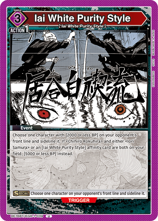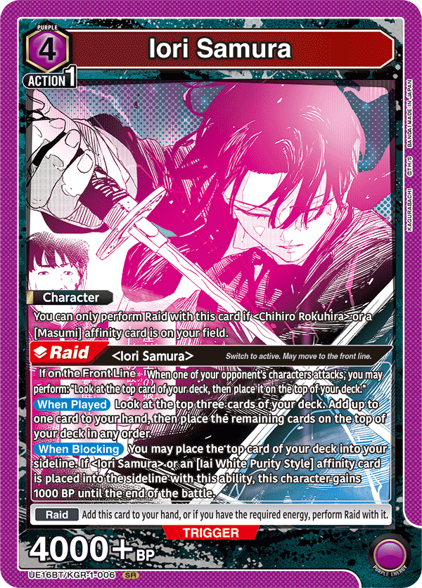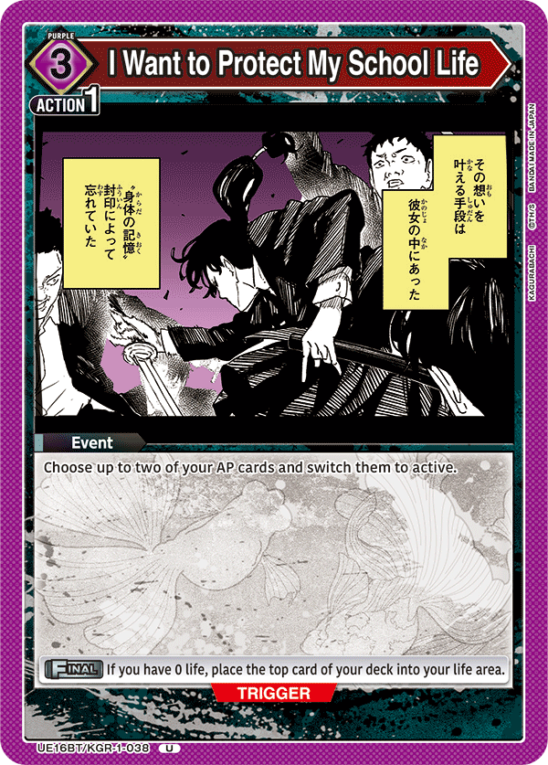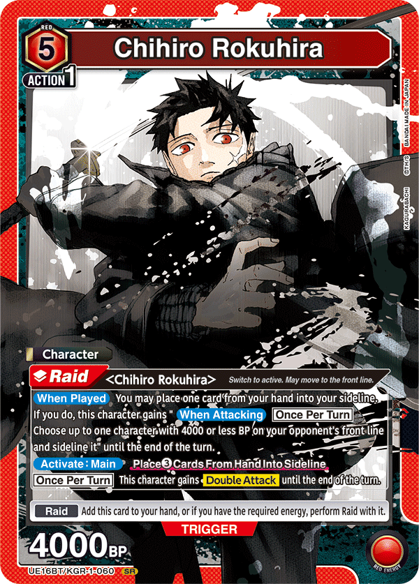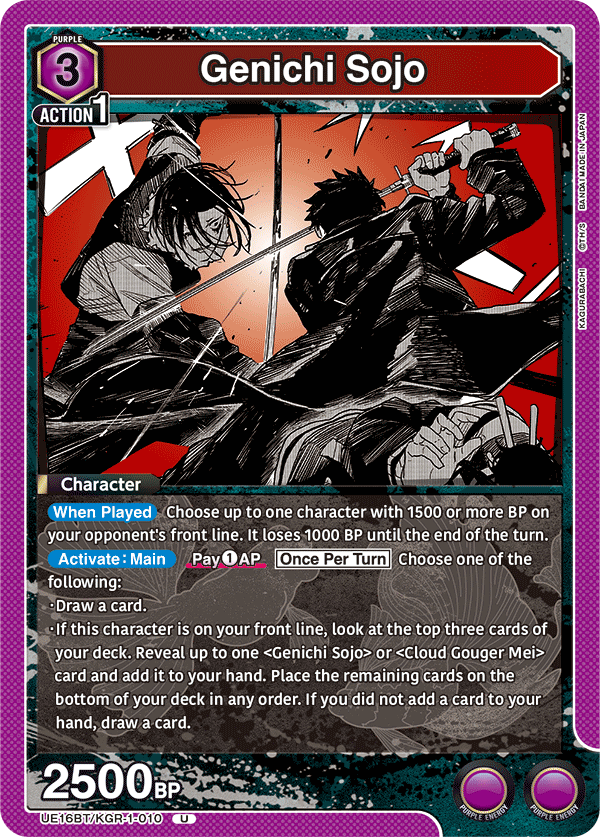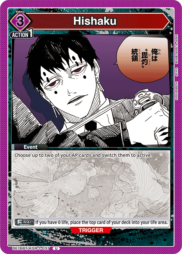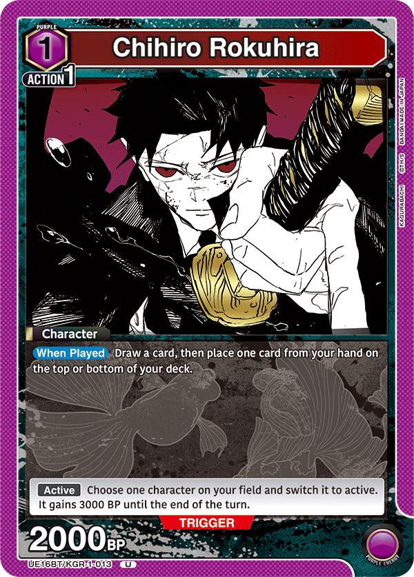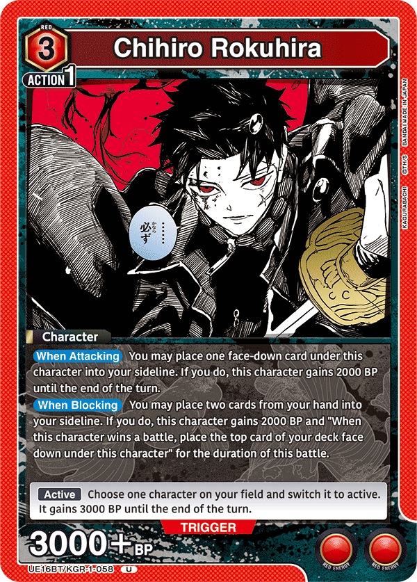 Kagurabachi is only the second set in the UNION ARENA English Version to have just two energy colors: Purple, and Red. However, given how powerful one of these colors is, it will still have a huge impact on the meta. Yet, it’s not just its two-color limit that makes this set stand out – it’s also the first ever manga-based set released in English. Diehard Kagurabachi fans (of which there are many) are going to go nuts over this massive set while players will buy it for its powerful strategies.