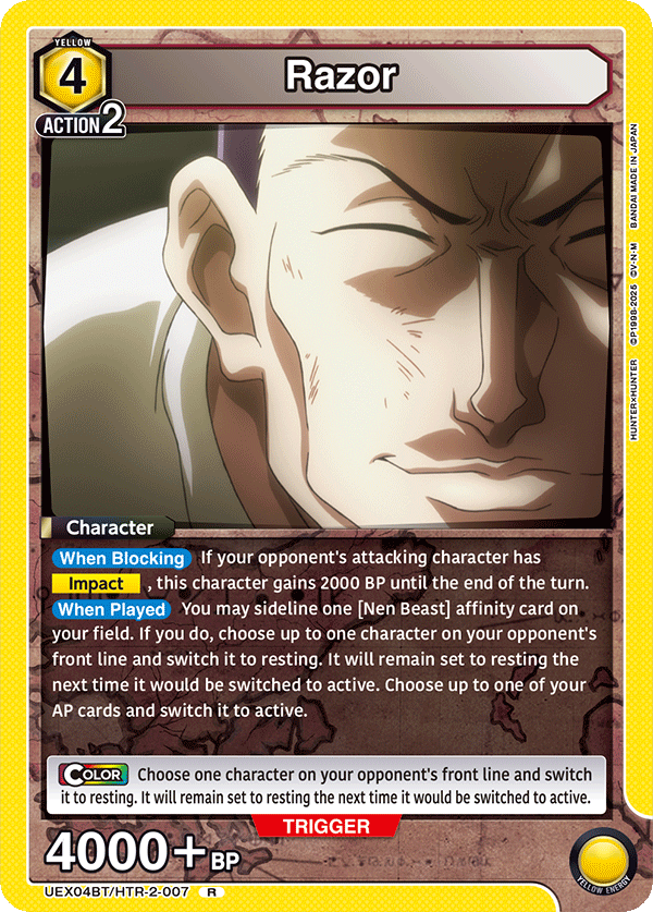 Thanks to the new yellow energy color, Hunter x Hunter has something it hasn’t really had before: access to a very solid removal strategy. Five-cost Razor lets you sideline a character when he is played based on how many [Nen Beast] affinity cards and face-down cards are under characters on your front line. You get 1000 in your range for each.