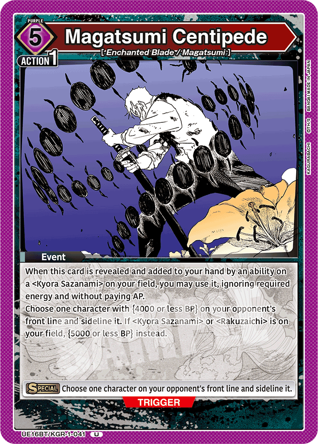 Red Chihiro may get all of the attention in Kagurabachi’s debut UA set, but Sojo also has a very high power ceiling – although you will need to get a lot more pieces together to see that strategy pay off. To start things off, you have the Sojo Raid that brings powerful removal capabilities to the Purple energy deck – just in line with this energy color’s penchant for BP reduction.