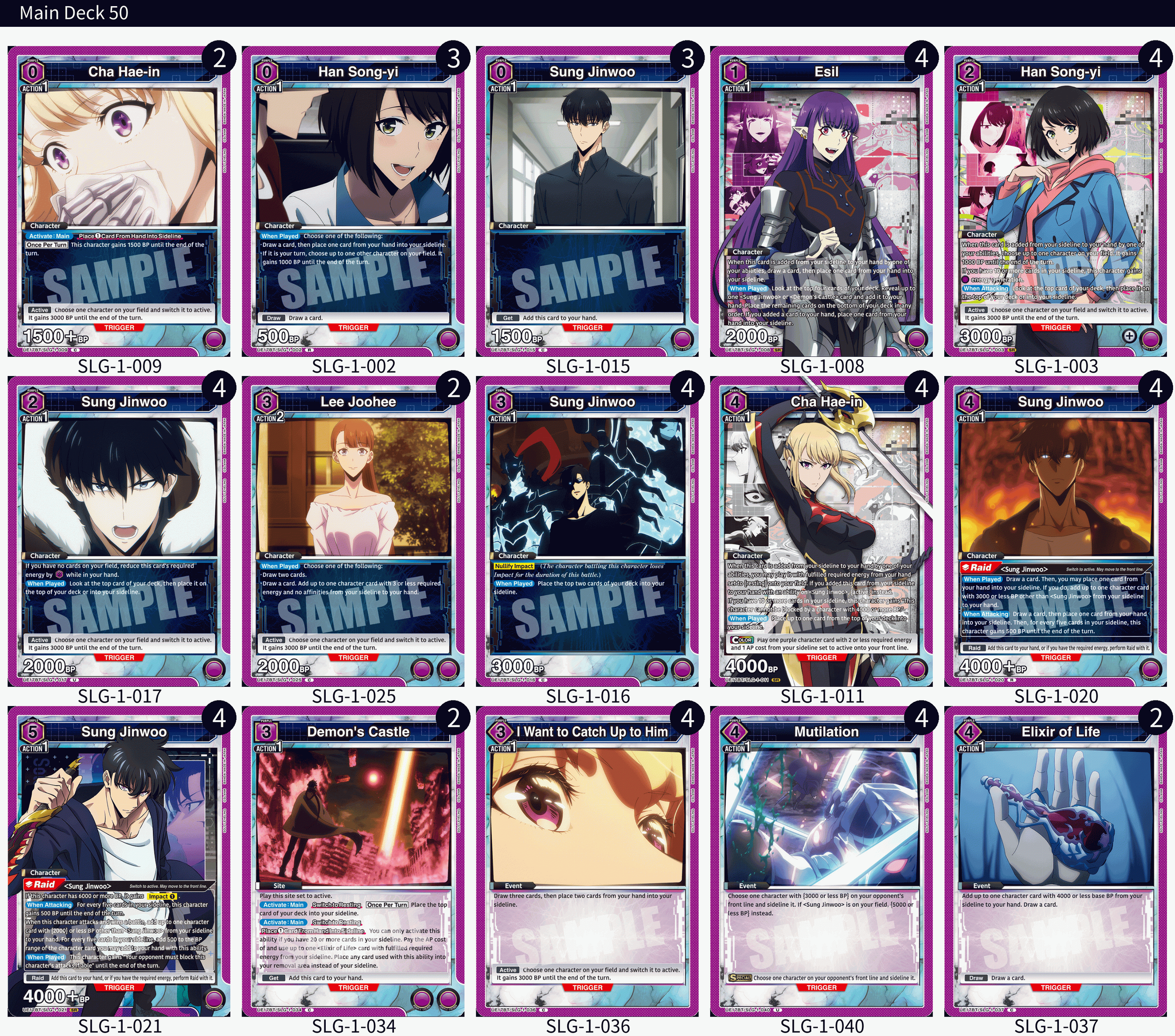 I’m leaving this deck as “Green Solo Leveling” because it truly captures the core mechanic of the show that makes Sung Jinwoo so formidable – his ability to always be leveling up. In the deck, this manifests in a unique mechanic we’ve not seen before – Raid’s that can essentially Raid over other Raids. That’s not exactly what’s going on here as technically the Raid card is raiding over “the base” card of the Raid (Raid cards can’t technically Raid over other characters with Raid). However, in essence, in this deck is always getting stronger.