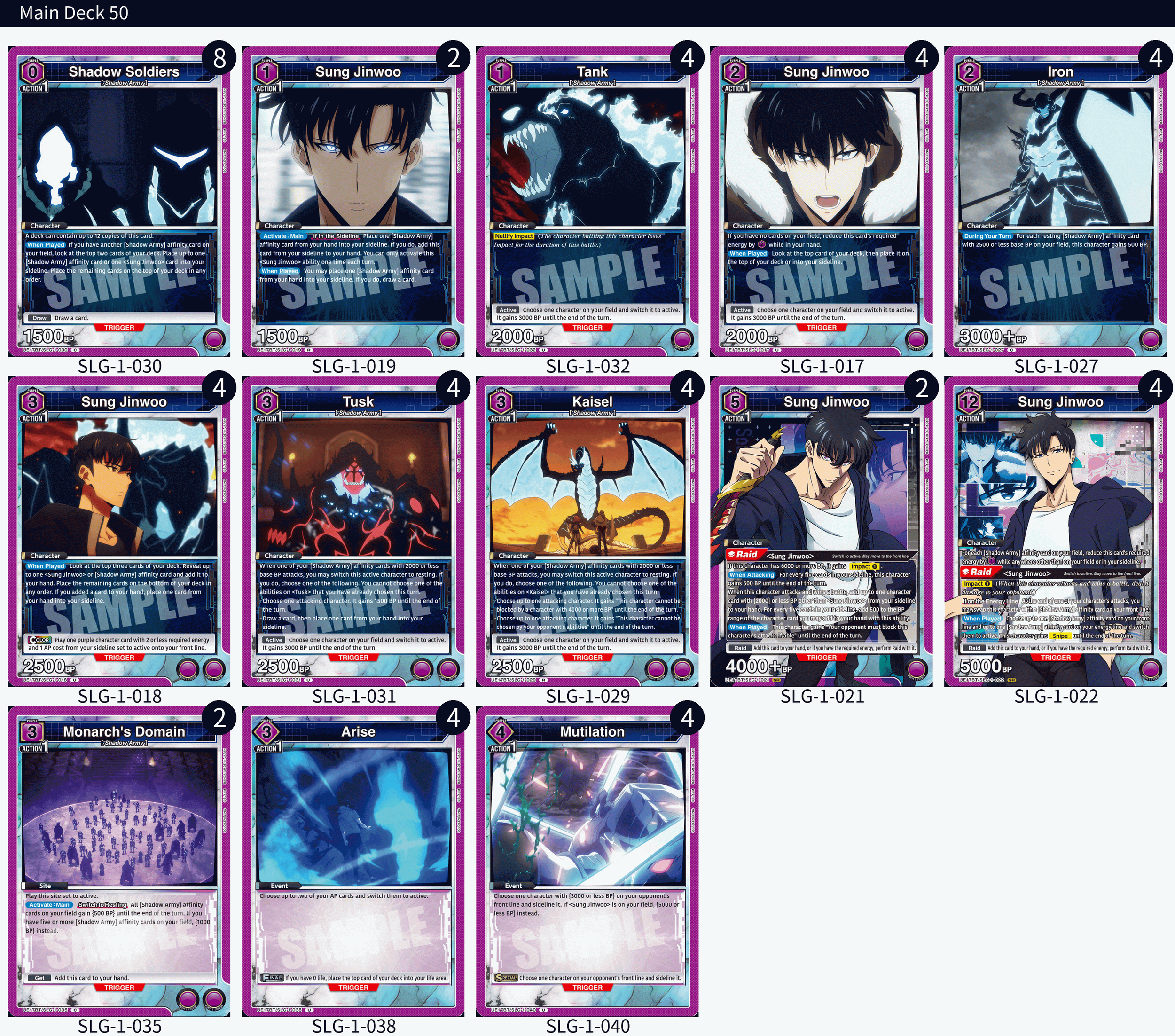 The Purple Sung Jinwoo deck (not to be confused with the other Purple Shadow Army deck) feels like the strongest and most consistent of all the Solo Leveling decks to me. Taken as a whole, it has some pretty insane power. Let’s start with the most obvious powerhouse – the Raid Sung Jinwoo.