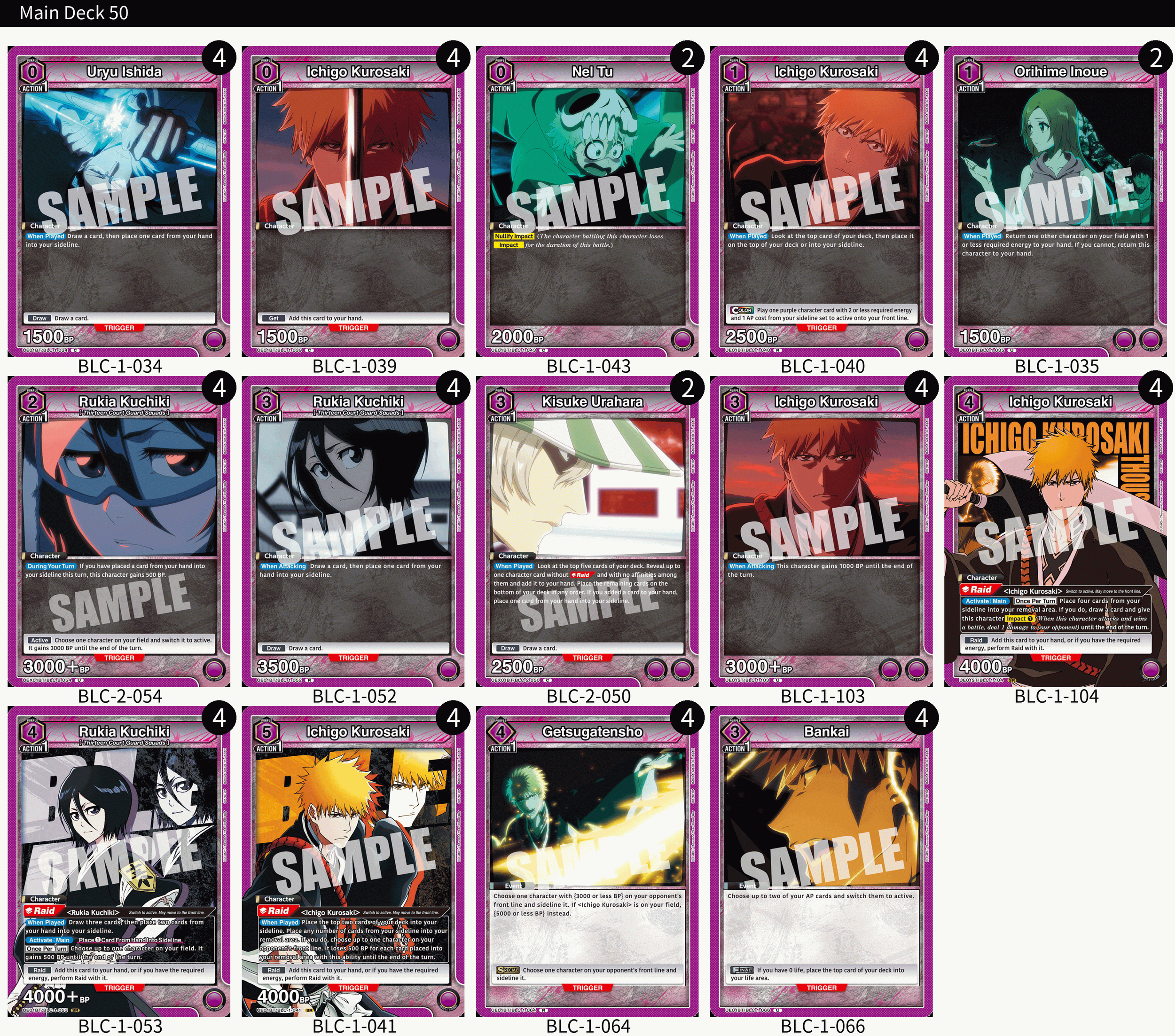 I have a new version of this deck I’ve been testing, and after going undefeated at a store tournament, it feels about time to share this deck with the world. I call it Ichigo/Rukia Turbo, and it’s the ideal fit for anyone looking for a Purple BLEACH deck with the same feel as the original, only upgraded to be faster, stronger, and more deadly than ever – deadly enough to deal with the challenges posed by the current UNION ARENA metagame.