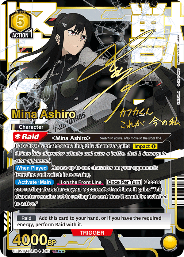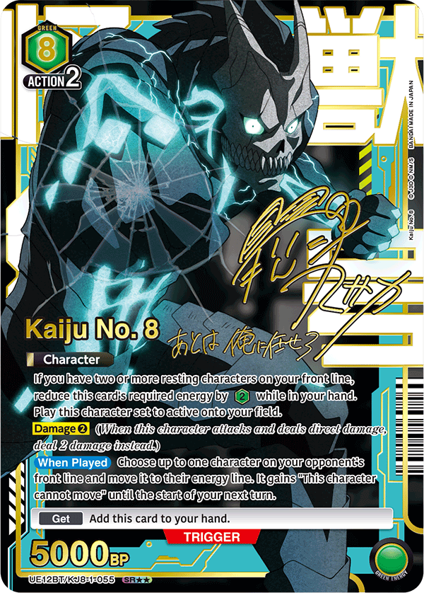 While the SR*** doesn’t have a signature, we do get one with the SR** for Kaiju No. 8 himself, making this card a must-have for any serious collector. It should be worth a similar value to the Mina SR**, but I’d give the slight edge to Mina in terms of price.