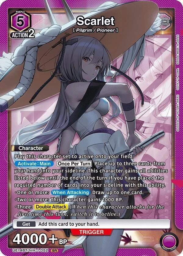 Generally speaking, Scarlet is a just a broken card that could fit into any NIKKE Purple deck, even if it’s not playing into the triggerless strategy. Having a potential 5000 BP double attacker that lets you draw when attacking is just really hard to say no to, and it’s not like meeting her full effects is all that hard to do.